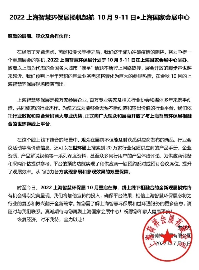 時(shí)至今日,2022上海智慧環(huán)保展10月重啟在即,線上線下相融合的全新觀展模式終有機(jī)會(huì)得以呈現(xiàn),我們將加倍宣傳的投入,確保平臺(tái)效果,相信上海智慧環(huán)保展必將為行業(yè)的復(fù)蘇和振興翻開全新篇章。如您需了解上海智慧環(huán)保展和世環(huán)通服務(wù)的更多信息,請(qǐng)隨時(shí)與我們聯(lián)系。真誠期待與您再聚上海國家會(huì)展中心!祝愿您和家人健康平安!