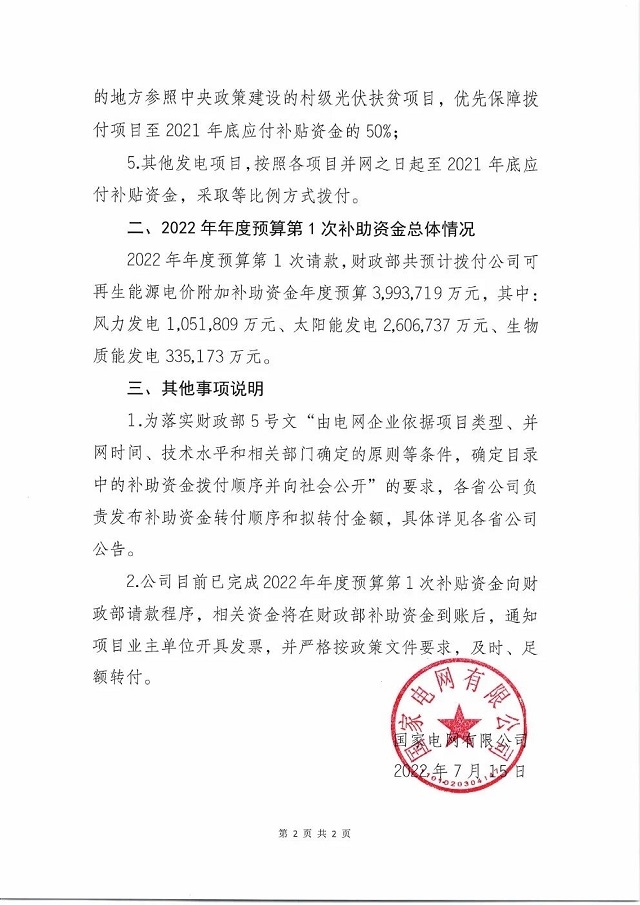 2022年7月15日,國家電網(wǎng)微信平臺發(fā)布“關(guān)于2022年年度預(yù)算第1次可再生能源電價附加補助資金撥付情況的公告”,提到將對納入補貼或清單且滿足結(jié)算條件的各類項目進行及時、足額轉(zhuǎn)付。