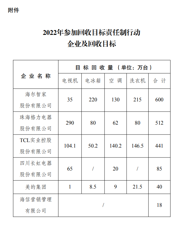 2022年5月,國家發(fā)展改革委辦公廳、工業(yè)和信息化部辦公廳、生態(tài)環(huán)境部辦公廳印發(fā)《關(guān)于做好2022年家電生產(chǎn)企業(yè)回收目標責(zé)任制行動有關(guān)工作的通知》,確定了6家開展2022年回收目標責(zé)任制行動的企業(yè)(見附件)。