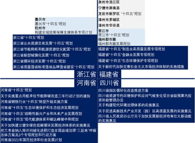 除試點(diǎn)四省外,全國其余省與自治區(qū)均積極響應(yīng)全國“十四五”規(guī)劃對用能權(quán)市場建設(shè)的要求。如下圖所示,我國大陸所有省份均在省級規(guī)劃中將用能權(quán)市場列入,在省級層面對用能權(quán)市場建設(shè)提供支持,多市在市級層面出臺政策與規(guī)劃,進(jìn)一步提高對用能權(quán)市場建設(shè)的支持力度。有關(guān)政策覆蓋生態(tài)環(huán)境保護(hù)、高碳行業(yè)低碳改造、產(chǎn)業(yè)轉(zhuǎn)型升級、金融、環(huán)境權(quán)益交易市場協(xié)調(diào)建設(shè)等多個(gè)領(lǐng)域,為我國建設(shè)全國用能權(quán)交易市場以通過市場化手段促進(jìn)產(chǎn)業(yè)提效轉(zhuǎn)型、推動(dòng)綠色發(fā)展具有顯著促進(jìn)作用。