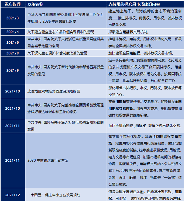 除《意見》外,2021年全年國家層面陸續(xù)發(fā)布多項(xiàng)政策,明確用能權(quán)交易機(jī)制建設(shè)在生態(tài)文明建設(shè)、碳達(dá)峰碳中和目標(biāo)、生態(tài)環(huán)境治理、綠色金融、小微企業(yè)支持及推動(dòng)我國中部地區(qū)和成渝雙城經(jīng)濟(jì)圈等局部地區(qū)高質(zhì)量發(fā)展過程中的重要地位。