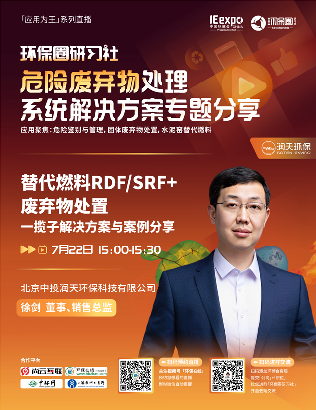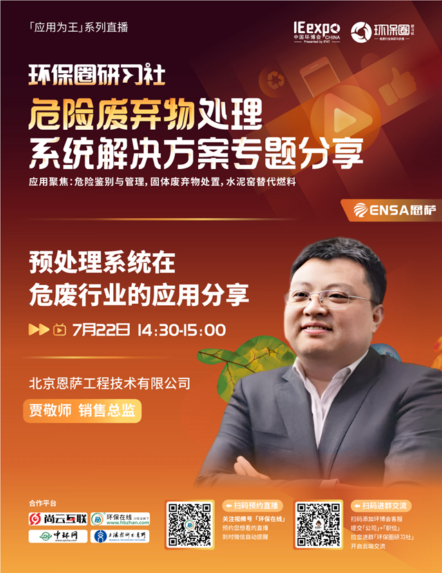 7月22日(星期五)下午14:00-15:30,環(huán)保圈研習(xí)社“應(yīng)用為王”系列直播,危險(xiǎn)廢棄物處理系統(tǒng)解決方案專題分享,我們有幸邀請(qǐng)到了上海化工院、北京恩薩、潤(rùn)天環(huán)保3家企業(yè)的技術(shù)專家做客直播間,與我們共同探討危險(xiǎn)廢棄物的鑒別與管理,危廢焚燒預(yù)處理,水泥窯協(xié)同處置等技術(shù)及相關(guān)解決方案。