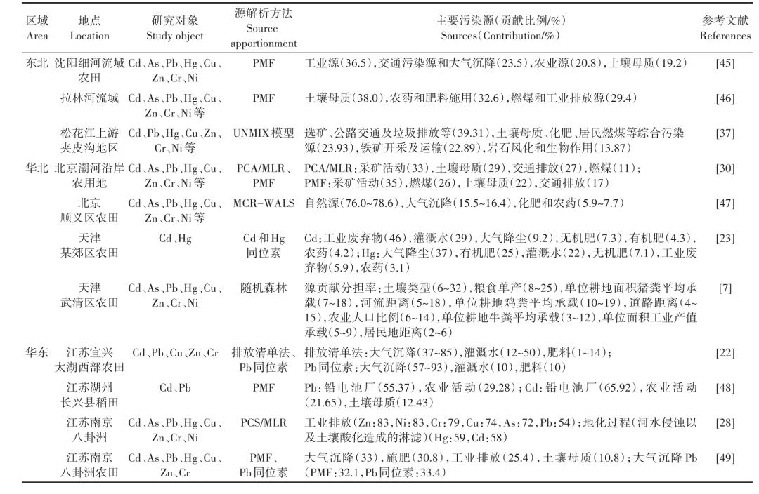 關(guān)于華北地區(qū)土壤重金屬源解析的近期文章共發(fā)現(xiàn)了13篇,涉及北京、天津、河北、山西和內(nèi)蒙古地區(qū)的2831個表層土壤樣品,所采用的定性源解析方法主要為PCA、相關(guān)性分析、空間分析等,定量源解析方法有PMF、PCA-MLR、同位素比值法等(表3)??傮w上,華北地區(qū)農(nóng)田土壤中的主要污染重金屬元素是Cd,其次有Cu、Hg、Zn、Pb等。該地區(qū)農(nóng)田土壤中的As、Cr、Ni主要受土壤母質(zhì)的控制,個別地方的As還有采礦活動和大氣沉降的貢獻;除此以外,其余重金屬元素都受到一定程度的外源污染。Cd、Cu和Zn的污染來源仍以農(nóng)業(yè)活動(肥料、農(nóng)藥、灌溉水)為主,部分地區(qū)Cd還受到工業(yè)活動的影響。對于Pb的來源,土壤母質(zhì)、采礦活動、大氣沉降、污水灌溉等都有一定程度的貢獻。Hg主要受大氣沉降和灌溉水控制,局部地區(qū)有工業(yè)活動的影響。對于工業(yè)區(qū)周邊的非農(nóng)田土壤來說,重金屬的累積明顯與工業(yè)活動、燃煤、交通排放緊密相關(guān)。