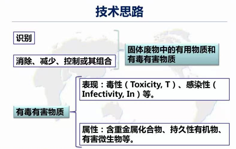 固廢管理的技術(shù)思路分為兩類,一方面應識別固廢中的有用物質(zhì)對其進行資源化利用;而另一方面對表現(xiàn)出毒性、感染性等含重金屬化合物、持久性有機物和有害微生物等有毒有害物質(zhì)需著力消除、減少、控制或使用組合措施。廢物處理中通常需要加入能量與化學物質(zhì),在轉(zhuǎn)化得到產(chǎn)品的同時可能產(chǎn)生大氣排放、水體排放與工藝殘余物,需要關注與控制。