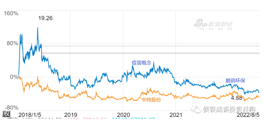 鵬鷂環(huán)保2018年1月份A股上市,增發(fā)8000萬股,融資6個多億。2018年,公司市值借著行業(yè)東風達到150億,然后環(huán)保行業(yè)一路走低,鵬鷂市值也跟著一路下滑。2020年公司投資了疫苗概念股,市值反彈到80億。概念過后,一路走低到今天的38億。
