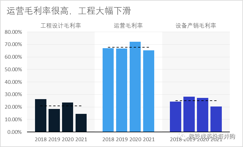 我們再看下各板塊的毛利,工程的收入規(guī)模雖大,但毛利極低。而運營板塊是其核心資產。這個也好理解,一般而言工程業(yè)務輕資產,毛利率雖然很低,但凈資產收益率不低。運營板塊很多都是重資產,凈資產收益率可能很低。
