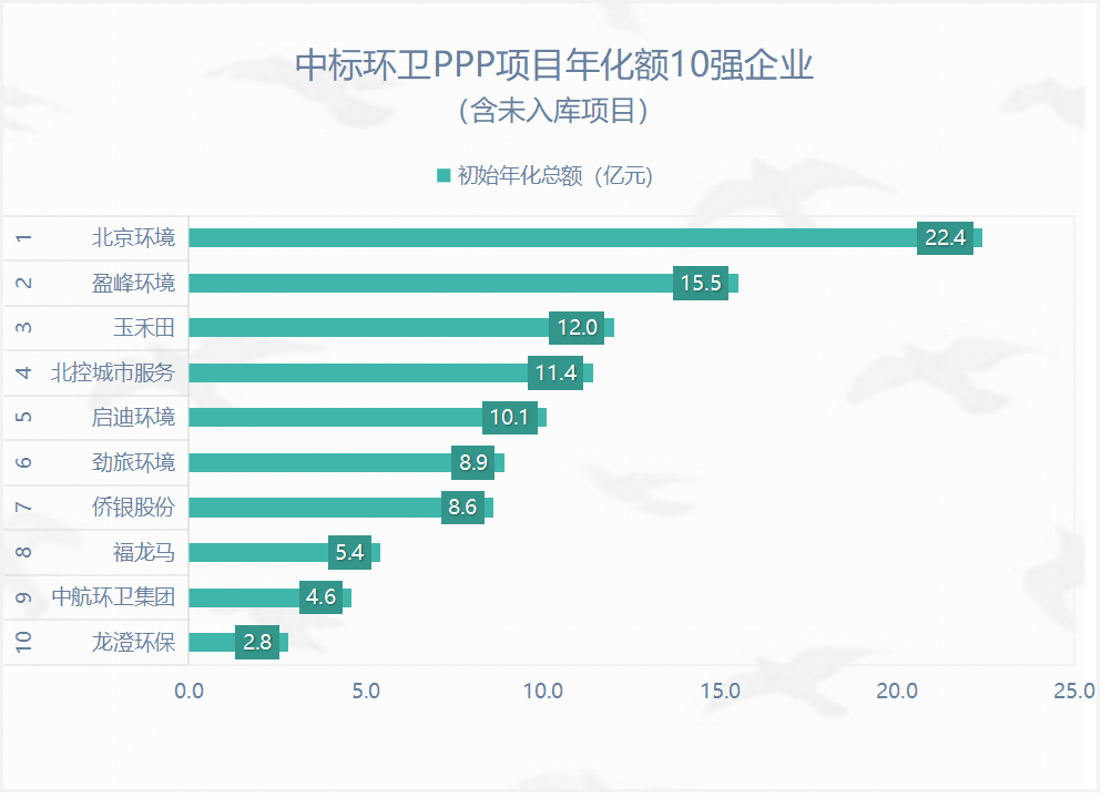 在337個(gè)已開標(biāo)環(huán)衛(wèi)PPP項(xiàng)目中,北京環(huán)境已中標(biāo)環(huán)衛(wèi)PPP項(xiàng)目年化總額超過(guò)22億元(按初始年化額計(jì)算),排名第一,占全部已開標(biāo)環(huán)衛(wèi)PPP項(xiàng)目年化總額的13%。
