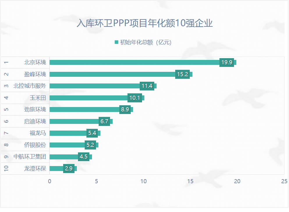 在302個(gè)入庫(kù)且已開標(biāo)環(huán)衛(wèi)PPP項(xiàng)目中,北京環(huán)境入庫(kù)項(xiàng)目年化總額接近20億元(按初始年化額計(jì)算),排名第一,占全部已入庫(kù)且已開標(biāo)環(huán)衛(wèi)PPP項(xiàng)目年化總額的13%。