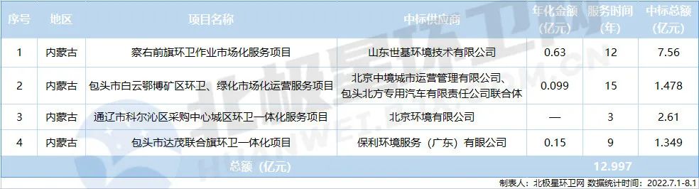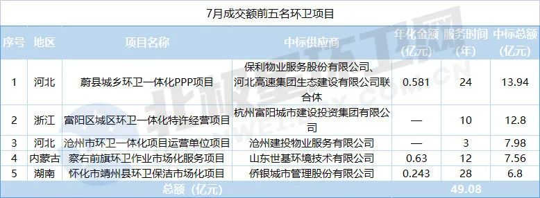 而內(nèi)蒙古市場令人稍感驚喜,7月爆出多個億級環(huán)衛(wèi)項目,成交總額約13億元。