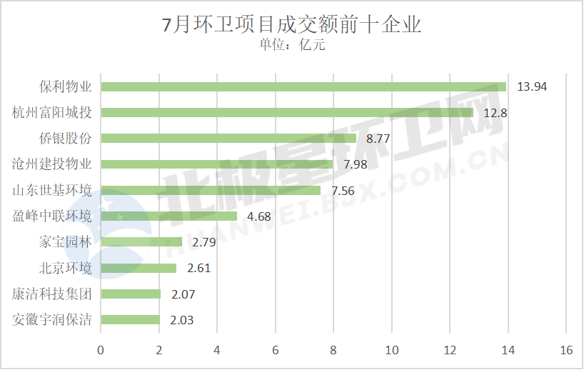 最終,保利物業(yè)、杭州富陽城投、僑銀股份、滄州建投物業(yè)、世基環(huán)境、盈峰環(huán)境、家寶園林、北京環(huán)境、康潔科技集團、安徽宇潤保潔沖進7月前十位排行榜。