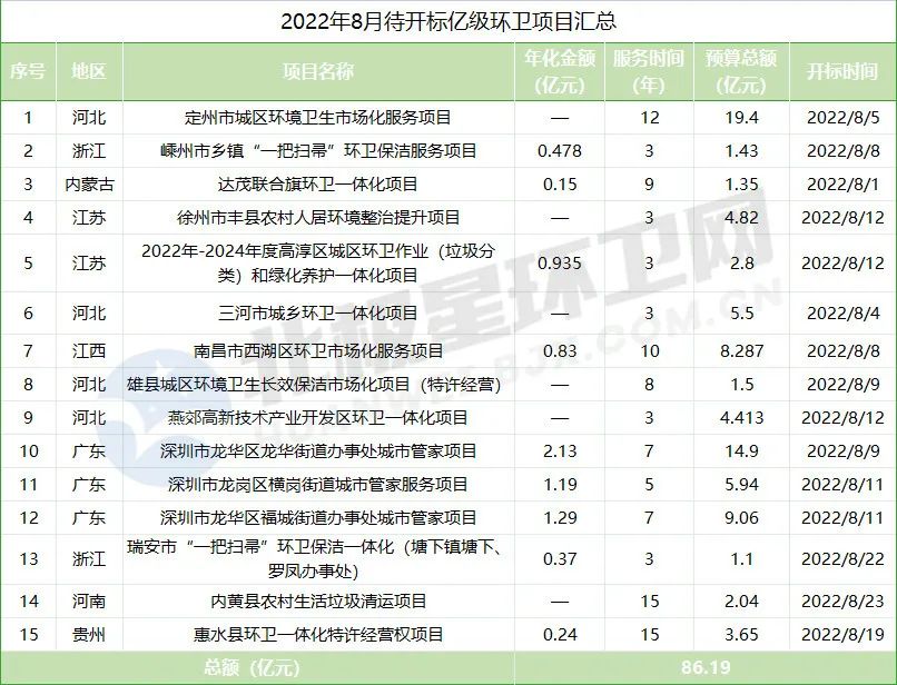 除此之外,北極星環(huán)衛(wèi)網(wǎng)還統(tǒng)計了8月待開標的億級環(huán)衛(wèi)項目,預算總額約86.2億元,主要分布在華北地區(qū)和東南地區(qū)。