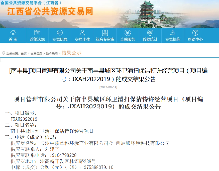 江西省公共資源交易中心消息,8月31日,南豐縣城區(qū)環(huán)衛(wèi)清掃保潔特許經(jīng)營(yíng)項(xiàng)目公布開標(biāo)結(jié)果,中標(biāo)情況如下: