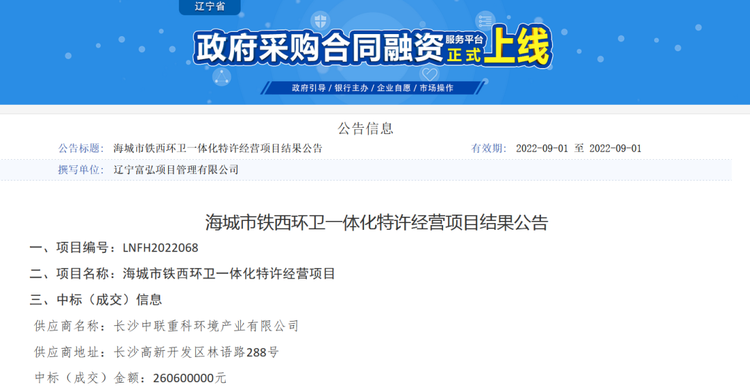 遼寧省政府采購(gòu)網(wǎng)消息,8月31日,海城市鐵西環(huán)衛(wèi)一體化特許經(jīng)營(yíng)項(xiàng)目公布開標(biāo)結(jié)果,中標(biāo)情況如下: