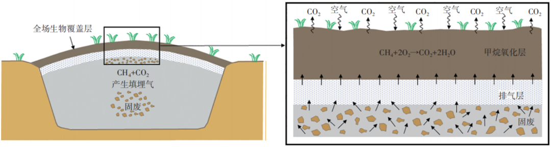 生態(tài)型土質(zhì)覆蓋層具有良好的閉氣功能,能夠有效降低填埋氣排放。同時由于土體多孔的特性,生態(tài)型土質(zhì)覆蓋層不會完全阻斷填埋氣向大氣遷移,而且覆蓋層土壤中廣泛存在分解污染性填埋氣的微生物,這些微生物以污染性填埋氣為“糧食”,能夠實現(xiàn)填埋場長效碳減排(圖6)。