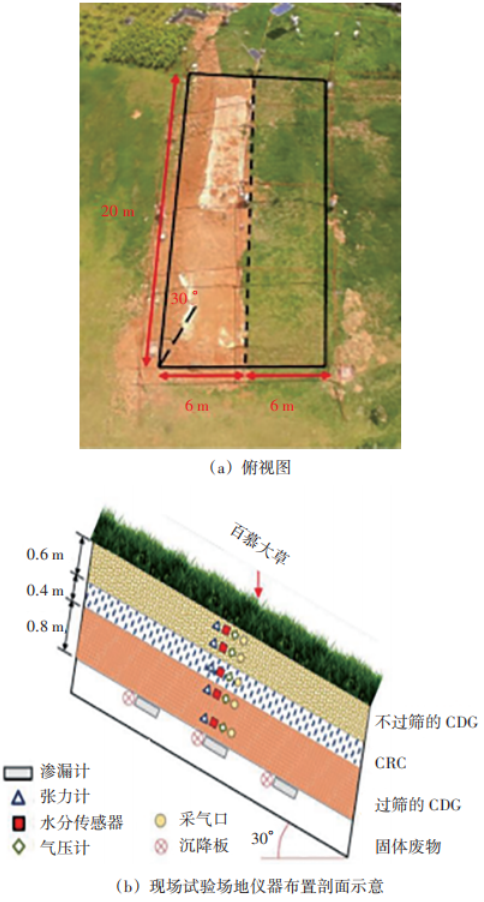 香港科技大學吳宏偉教授團隊于2016 年在深圳下坪生活垃圾填埋場二期西段建設了全天候3層覆蓋層試驗區(qū),如圖9所示,其中一半覆蓋層試驗區(qū)種植百慕大草,另一半作為參照組,坡面不種植任何植物,并由無紡土工布覆蓋,以防止降雨期間地表侵蝕。該覆蓋層坡度為30°,經(jīng)受深圳數(shù)次強臺風暴雨依然穩(wěn)定,有效提升了填埋場庫容。為驗證3層土質(zhì)覆蓋層的防滲性能,對覆蓋層試驗場進行了長達54個月的監(jiān)測,包括降雨量、覆蓋層滲漏量、孔隙水壓力及含水量變化等。現(xiàn)場監(jiān)測數(shù)據(jù)表明,無膜的全天候3層覆蓋層在濕潤區(qū)年均滲漏量低于北美濕潤區(qū)覆蓋層設計標準。