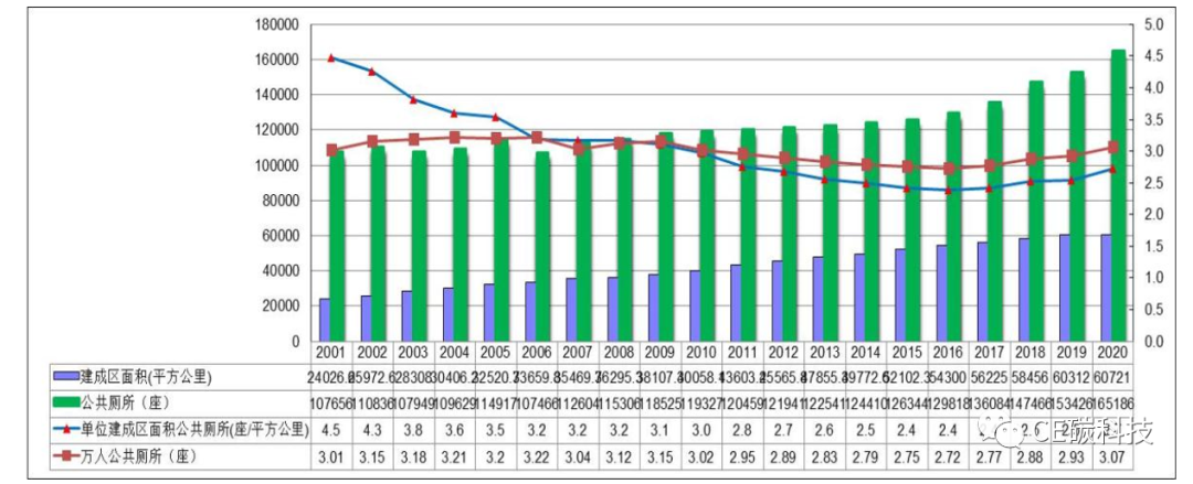 2020年,我國公共廁所配置數(shù)量為每萬人3.07座,單位建成區(qū)面積2.7座/平方公里。上述數(shù)據(jù)均包含附屬式公共廁所,若不考慮附屬式公廁,我國公廁配置則很難達(dá)到標(biāo)準(zhǔn)要求。