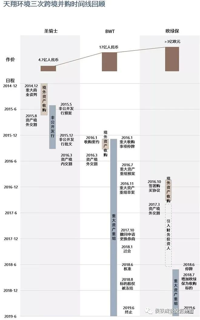 原本的十大并購案例,寫著寫著寫成了十大環(huán)保并購慘案。為了緩解大家失落悵惘的心情,免費奉上一個跌到谷底的案子,大家再忍一忍,黎明前的黑暗。本文為環(huán)保十大并購案例之五,天翔環(huán)境海外收購圣騎士、BWT、歐綠保,最終公司破產退市。我們之前看的幾個并購失敗案例,雖然也都是十年苦心經營,毀于一旦,但大部分只是元氣大傷,主營業(yè)務利潤虧光,大股東黯然離場而已。今天的案例,并購的后果是上市公司破產退市,大股東債務纏身被檢查機關起訴,員工債權人均蒙受巨大損失。里里外外大幾十億的虧損,堪稱“環(huán)保上市公司十年內最大的慘案”。歡迎大家多提寶貴意見。尋找底層規(guī)律,帶動行業(yè)發(fā)展,避免低級錯誤重現。幾經掙扎的天翔環(huán)境最終還是在2021年8月30日迎來了被深交所摘牌的結局。天翔環(huán)境原名天保重裝,原主業(yè)為大型節(jié)能環(huán)保及清潔能源設備,具體包括分離機械系列設備和水輪發(fā)電機組設備,并于2014年完成上市。當時,天翔環(huán)境的主營已露疲態(tài),上市當年收入下滑超過30%,公司開始尋找轉型方向。2015年開始,天翔環(huán)境通過連續(xù)的大手筆并購進軍環(huán)保領域,先后以4.7億收購美國的污泥處理設備公司圣騎士、17億收購德國的水處理公司BWT,并在隨后迎來了自己的高光時刻,2016年底,其市值來到了107.5億的歷史最高值。好景不長,因為體外并購未能裝入上市公司,導致了一系列問題,悲劇大幕就此拉開。2018年,天翔環(huán)境在年報中披露,控股股東直接控制的成都親華科技有限公司非經營性資金占用24.55億,而當時天翔環(huán)境本身的債務逾期金額已達到17.58億。從此,天翔環(huán)境股價持續(xù)下跌,直至2021年8月30日最終被深交所摘牌。回顧天翔環(huán)境的發(fā)展歷程,核心是三次海外收購,分別是2014年12月收購的美國圣騎士,2016年1月收購的BWT公司,2016年10月收購的歐綠保,交易金額預期超過3億歐元。其中第一個交易順利完成,后面兩個交易只完成了體外收購,并沒有完成裝入上市公司的動作,最終也導致了上市公司與大股東的相繼崩盤。第一筆收購,公司與券商聯合成立基金,收購標的公司。然后上市公司非定向增發(fā),募集資金收購基金持股。收購與定增并行推進,加快交易節(jié)奏,順利地完成了交易。這個案子金額相對小,方案謹慎,交易結構簡單,資本市場當時資金充足,因此完成相對容易些。企業(yè)由此嘗到了甜頭,默認為其他項目也可以先收購,再定增裝入上市公司。2016年2月,僅僅在上市公司剛剛完成非公開發(fā)行一個月、圣騎士股權尚未完成交割之時,天翔環(huán)境又再次啟動了對更大的收購標的——估值達到2.2億歐元的德國水處理公司BWT。因為交易時間緊張,天翔和基金先籌集資金收購,然后再由大股東組建資金替代基金,大股東向其他人承諾兜底,最終由上市公司定增完成收購。在當時的背景下,是有很多基金愿意參與并購定增,同時也默認定增即可賺錢的邏輯,愿意參與這種有一定風險的投資。基金的收益在于定增后的股價增值,以及定增不成的大股東保底,風險在于定增后股價下跌,定增失敗后大股東無法保底。當時環(huán)境下,基金方總體上還是認為風險收益匹配的。這種情況跟當時的熱錢有關,即大部分資金來自信托,錢多無處可投。當時的資金投資邏輯并不穩(wěn)定,是一種特殊情況。但第二筆收購出現了問題,監(jiān)管機構審核達2年之久。兩個原因,一個是券商的原因,一個是資金的來源問題。最終獲得批文的時間已經是2018年6月。雪上加霜的是,公司在這筆交易尚未完成之際,大股東又組團以3億歐元的價格收購了更大的一家歐洲垃圾處理公司,同樣無法完成交易。這個時候大股東和上市公司都扛不住了,體外并購的杠桿利息,疊加當時嚴厲“去杠桿”的外部環(huán)境以及上市公司的PPP業(yè)務占用大量資金無法回收,跌跌不休的股價最終帶崩了大股東以及上市公司的債務崩盤。2018年8月,大股東企業(yè)親華科技持有中德天翔20.59%的股份被債權人凍結,導致上市公司收購中德天翔的交易無法完成交割。2019年1月24日上市公司公告收到證監(jiān)會立案調查通知書,此時天翔環(huán)境大股東因債務危機侵占上市公司資金已經公開。2019年6月19日,天翔環(huán)境公告終止收購中德天翔以及歐綠保的交易,大股東的過橋基金退出失敗,天翔環(huán)境開始自由解體。公司2021年年報披露,在2020年8月收到鄧親華及一致行動人鄧翔提供的成都市公安局出具 的《取保候審決定書》,2021年1月19日,公司、鄧親華、鄧翔被移送成都市人民檢察院審查起訴。整個故事中,公眾號“文藝馥欣”做了精彩的分析和點評,上述配圖和部分敘述來源于其公眾號文章,文末有相關鏈接。本案整個過程也比較清晰,公司上市后謀求發(fā)展轉型,先定增10億人民幣,發(fā)行收購了美國圣騎士公司,然后打算采用收購美國圣騎士公司的操作,體外收購德國的BWT公司,然后裝入上市公司。一筆17億的收購,并不是17億的虧損,為何會導致上市公司兩年累計虧損36億,大股東占用24億資金,依舊未能改變結果,反倒一起陷入泥潭,釀成驚天慘案呢?