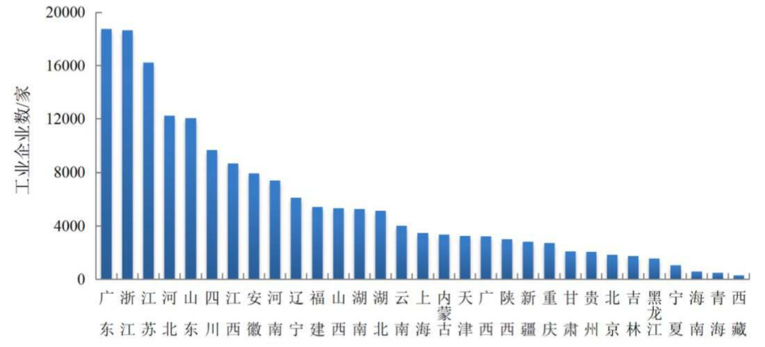 調(diào)查工業(yè)企業(yè)數(shù)量排名前五的地區(qū)依次為廣東、浙江、江蘇、河北和山東,分別為18734家、18665家、16223家、12239家和12068家。