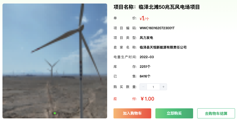 而這個(gè)標(biāo)價(jià)1元的風(fēng)電綠證,已售出8416個(gè),庫存僅2251個(gè)。