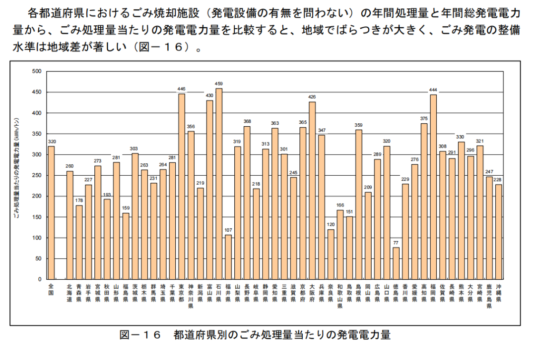 而2021年的日本二噁英污染清單顯示,火葬場(chǎng)的二噁英排放為3.6克TEQ,占比3.6%。同時(shí),根據(jù)日本環(huán)境省公開的2021年垃圾焚燒量和二噁英排放量數(shù)據(jù),可以得出日本2021年垃圾焚燒的每噸二噁英排放因子,為1.235微克每噸。我國(guó)2020年,爐排爐二噁英排放因子為0.1206微克每噸,日本垃圾焚燒項(xiàng)目的平均垃圾二噁英排放因子,為我國(guó)爐排爐十倍,加權(quán)平均因子的8倍。(我國(guó)排放因子數(shù)據(jù),來自清華大學(xué)劉建國(guó)教授論文《National and provincial dioxin emissions from municipal solid waste incineration in China》) 垃圾焚燒廠中,大部分僅為余熱利用,少部分為余熱發(fā)電70.9%的垃圾焚燒設(shè)施(共729個(gè))實(shí)施了余熱利用。余熱利用的具體方式包括給溫泉、溫水游泳池和周邊居民供熱等。有396個(gè)垃圾焚燒設(shè)施配備了發(fā)電設(shè)備,占所有設(shè)施的38.5%。這些發(fā)電設(shè)施的裝機(jī)總量,為2149MW。總發(fā)電量為10452GWh,發(fā)電效率的平均值為14.22%。垃圾焚燒設(shè)施的平均發(fā)電量,約為320 kWh/噸。各都道府縣的垃圾焚燒發(fā)電廠,發(fā)電量出現(xiàn)明顯巨大差異。從趨勢(shì)上看,日本的垃圾焚燒,噸發(fā)電量水平,略弱于我國(guó)現(xiàn)有情況。