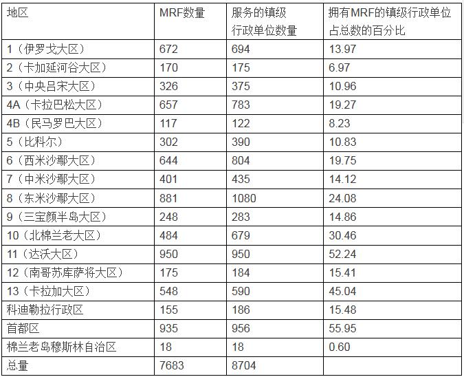 2012年時,菲律賓全國有7683個回收利用設(shè)施,滿足了8704個鎮(zhèn)的需求。下表列出了菲律賓全國回收利用設(shè)施的狀況。