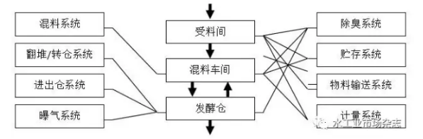 (2)全機械化流程。污泥堆肥全機械化流程需要至少八個目的不同但相互關(guān)聯(lián)的機械子系統(tǒng)配合完成,如圖2所示。