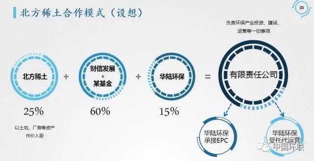 以北方稀土環(huán)保治理為例來分析,2018年新增的環(huán)保需求為:2000方/天氯化銨廢水處理零排放項目、約10萬噸/年的低放射性固體廢棄物處置、約4000噸/年的普通固體廢棄物處置,預計總投資額達1個億。目前,北方稀土環(huán)保產(chǎn)業(yè)已投入6.7億,每年運營費用5000萬,環(huán)保企業(yè)參差不齊,達產(chǎn)效果僅達40%。針對北方稀土的環(huán)保需求,華陸環(huán)保提出了基于環(huán)?!傲恪蓖顿Y的合作模式。