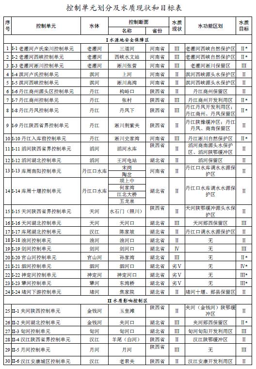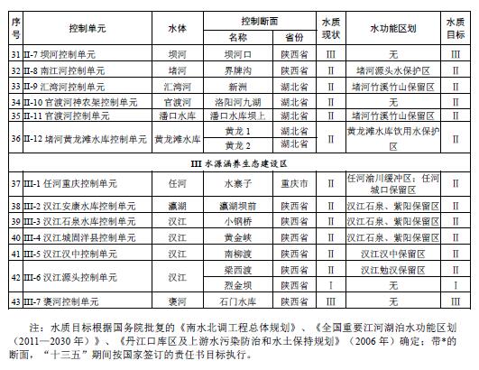 丹江口水庫(kù)和中線取水口水質(zhì)穩(wěn)定并保持Ⅱ類,庫(kù)區(qū)總氮濃度不劣于現(xiàn)狀水平;到2020年,漢江和丹江干流斷面水質(zhì)為Ⅱ類,其它直接匯入丹江口水庫(kù)的主要河流水質(zhì)達(dá)到水功能區(qū)水質(zhì)目標(biāo)。