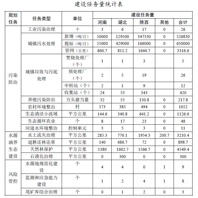圍繞規(guī)劃目標(biāo),規(guī)劃實(shí)施污染防治、水源涵養(yǎng)與生態(tài)建設(shè)、風(fēng)險(xiǎn)管控3大類建設(shè)任務(wù),估算總投資196億元。其中:工業(yè)污染防治項(xiàng)目26項(xiàng),估算投資6.00億元;城鎮(zhèn)污水處理新增污水處理能力526830噸/日,新增管網(wǎng)3317公里,提標(biāo)改造能力650000噸/日,估算投資43.17億元;垃圾和污泥采取收集、預(yù)處理、轉(zhuǎn)運(yùn)、焚燒進(jìn)行綜合處理,新增垃圾和污泥處理處置能力8000噸/日,估算投資35.62億元;養(yǎng)殖污染防治新增217.8萬(wàn)頭豬當(dāng)量治理能力,估算投資10.94億元;農(nóng)村環(huán)境綜合整治新增建制村1052個(gè),估算投資15.76億元;生態(tài)清潔小流域治理面積1126.6平方公里,估算投資11.27億元;生態(tài)循環(huán)農(nóng)業(yè)與面源污染綜合治理試點(diǎn)48個(gè),估算投資14.50億元;河道綜合整治(含人工濕地)11個(gè)控制單元,估算投資5.25億元;綜合治理水土流失面積3210平方公里,估算投資25.68億元;退耕還林還草和石漠化治理、天然林保護(hù)工程,估算投資16.4億元;水源地規(guī)范化建設(shè)項(xiàng)目9個(gè),估算投資5.93億元;監(jiān)測(cè)和應(yīng)急能力建設(shè)項(xiàng)目8個(gè),估算投資1.14億元;尾礦庫(kù)綜合治理3個(gè),估算投資4.35億元。