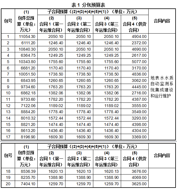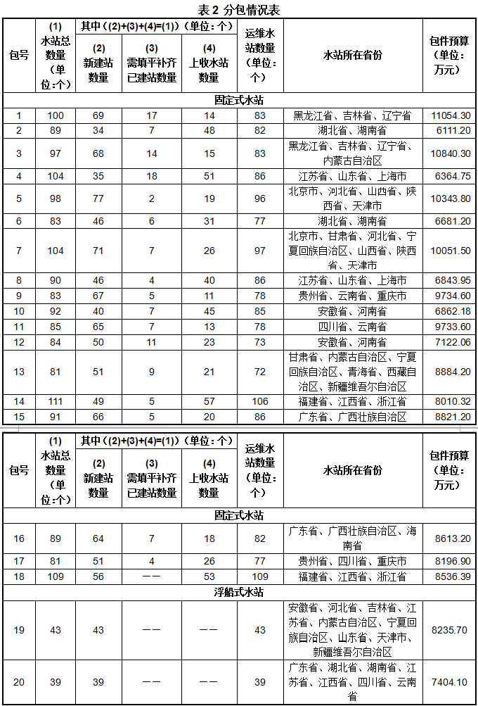 7. 招標(biāo)內(nèi)容為:招標(biāo)人計(jì)劃采購1087個(gè)國家地表水自動(dòng)監(jiān)測(cè)站(以下簡(jiǎn)稱水站)的建設(shè)及其三年運(yùn)維服務(wù)、531個(gè)已建水站的三年運(yùn)維服務(wù)、135個(gè)國家已建水站的儀器設(shè)備填平補(bǔ)齊。其中,1~18包為固定式水站,19~20包為浮船式水站。具體要求詳見第四章技術(shù)需求書。