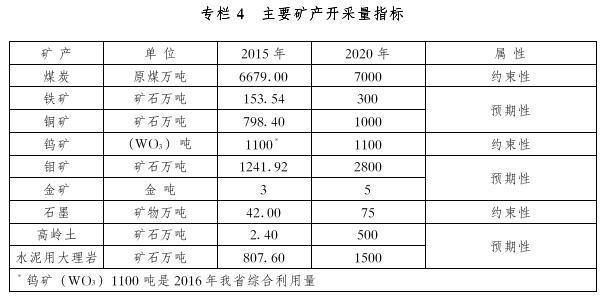 1.礦業(yè)對國民經(jīng)濟的支撐作用得到進一步增強。轉變發(fā)展方式,調(diào)整礦業(yè)結構,穩(wěn)定石油產(chǎn)量,壓縮煤炭過剩產(chǎn)能,大力發(fā)展石墨、鉬等新材料精深加工業(yè),到2020年全省采礦業(yè)產(chǎn)值力爭達到2500億元。
