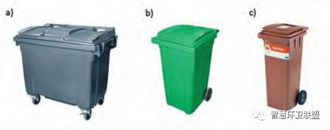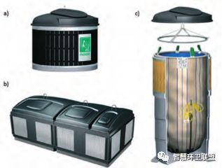 為了進(jìn)行廢物的投放,產(chǎn)業(yè)所有者或物業(yè)管理公司應(yīng)當(dāng)為住宅提供生活垃圾的投放點(diǎn)。投放時采用的容器分為普通容器(更為常用)和埋入式容器(正在普及)兩種。常用的普通投放容器分別為140升(圖8中c)、240升(圖8中b)、600升(圖8中a)這三種。普通投放容器的缺點(diǎn)是,雖然容積不大,但卻會占據(jù)將對較大的空間。埋入式容器部分設(shè)置于地下,內(nèi)部配備高強(qiáng)度織物容納袋,容納能力遠(yuǎn)高于普通容器,能夠在節(jié)省空間的同時,起到降低收運(yùn)頻次的作用。收運(yùn)時,收運(yùn)車輛會將織物袋從容器中取出,通過打開袋底的機(jī)關(guān)清空廢物。