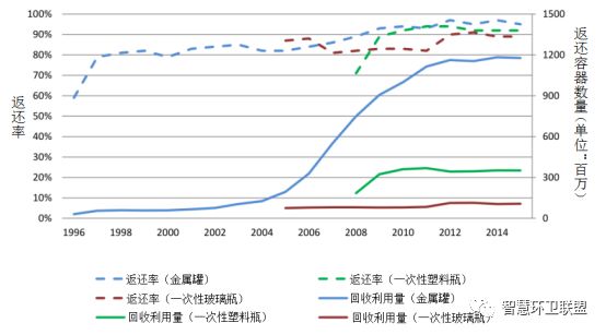 芬蘭的押金體系實(shí)現(xiàn)了極高的回收率。在PALPA體系剛剛成立的1996年,一次性金屬罐的回收率就已經(jīng)達(dá)到了59%,并馬上于第二年上升到了79%。到了2009年,金屬罐的回收率已經(jīng)超過90%。同樣地,PET瓶的押金體系在2008年開始實(shí)施時,返還率就已經(jīng)達(dá)到了71%,之后在兩年內(nèi)便上升到了90%以上。玻璃瓶在芬蘭擁有很長的押金制度實(shí)施積累,因此在PALPA在建立針對玻璃瓶的回收體系后,回收率就一直高于80%。從圖11還可以看出,一次性鐵罐的回收量自2004年起至2012年,一直都在迅速上升,并且保持穩(wěn)定的高回收率,反映出芬蘭飲料產(chǎn)業(yè)使用一次性金屬罐替代可重復(fù)使用玻璃瓶的趨勢。可重復(fù)使用玻璃瓶的回收率則更高,在2014年時為97%、2015年時為98%。