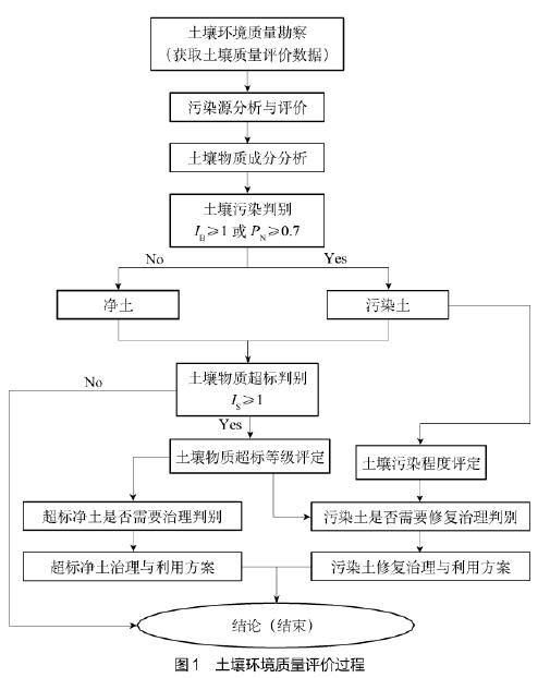 由圖1可知,土壤環(huán)境質(zhì)量評(píng)價(jià)包括土壤污染評(píng)價(jià)和土壤物質(zhì)符合環(huán)境質(zhì)量要求的評(píng)價(jià)兩部分內(nèi)容。其中,土壤污染評(píng)價(jià)主要包括土壤污染與否判別、土壤中致污物質(zhì)是否超標(biāo)判別與土壤污染程度評(píng)價(jià)。實(shí)施土壤環(huán)境質(zhì)量評(píng)價(jià)時(shí),首先應(yīng)判別某土壤是否受到了某物質(zhì)的污染,即確定該土壤是污染土還是凈土。然后,對(duì)于凈土,應(yīng)進(jìn)一步判別某物質(zhì)成分是否符合土壤質(zhì)量標(biāo)準(zhǔn)要求,如果符合土壤環(huán)境如果不符合土壤環(huán)境質(zhì)量要求,應(yīng)進(jìn)一步研究土壤的利用或治理方法。對(duì)于污染土,應(yīng)首先判別致污物質(zhì)含量是否符合土壤環(huán)境質(zhì)量要求,如果致污物質(zhì)含量符合土壤環(huán)境質(zhì)量要求,給出結(jié)論并結(jié)束評(píng)價(jià);如果致污物質(zhì)含量不符合土壤環(huán)境質(zhì)量要求,應(yīng)結(jié)合土壤污染程度評(píng)價(jià)結(jié)果,進(jìn)一步研究污染土利用、修復(fù)或治理方案。