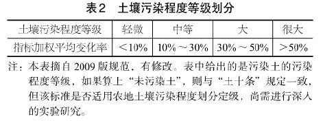 (4)土壤污染程度等級(jí)劃分。土壤污染程度是指侵入土壤的致污物質(zhì)對(duì)土壤成分及土體結(jié)構(gòu)和性質(zhì)的綜合影響程度,不僅指土壤成分和結(jié)構(gòu)的變化程度,還包括土體強(qiáng)度、變形、滲透、腐蝕、吸附、酸堿度、氧化還原、生物養(yǎng)分、毒性等的變化程度,具體視土壤污染程度評(píng)價(jià)的目的而定,對(duì)于農(nóng)地土壤,宜側(cè)重于土壤化學(xué)成分評(píng)價(jià);對(duì)建設(shè)用地,宜側(cè)重于土體強(qiáng)度、變形等力學(xué)性質(zhì)評(píng)價(jià)。確定土壤污染程度時(shí),應(yīng)首先分別計(jì)算出每種致污物質(zhì)所引起的土壤成分、結(jié)構(gòu)和各種性質(zhì)指標(biāo)變化的變化率(污染前后指標(biāo)的差值與污染前指標(biāo)值之百分比)。然后,分別計(jì)算各指標(biāo)變化率的平均值。然后,再計(jì)算各指標(biāo)平均變化率的加權(quán)平均值。最后,依據(jù)加權(quán)平均變化率按表2確定土壤污染程度等級(jí)。