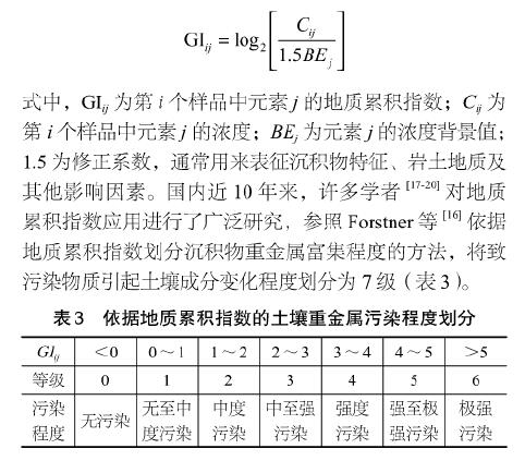 5)致污物質(zhì)對(duì)土壤物質(zhì)成分的影響程度評(píng)價(jià)。除了規(guī)范HJ/T166規(guī)定的內(nèi)梅羅指數(shù)法,還可選用地質(zhì)累積指數(shù)法。地質(zhì)累積指數(shù)(geoaccumulationindex,GI)是法國(guó)科學(xué)家Muller[14]于1969年提出的用于定量評(píng)價(jià)沉積物(或其他物質(zhì))中重金屬富集程度的指標(biāo)[15,16],其表達(dá)式如下: