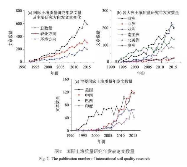 進(jìn)入20 世紀(jì)90 年代以來(lái),國(guó)際上對(duì)土壤質(zhì)量的研究熱度不斷升高,相關(guān)文獻(xiàn)呈井噴式出現(xiàn)。國(guó)際土壤質(zhì)量研究年發(fā)文總量在1992—2008 年左右呈緩慢上升狀態(tài),2008 年之后呈現(xiàn)快速發(fā)展?fàn)顟B(tài)[圖2(a)],而土壤質(zhì)量研究的兩個(gè)主要方向(WOS給出) 農(nóng)業(yè)方向和環(huán)境方向的關(guān)注度也在不斷升溫,土壤質(zhì)量研究相對(duì)更偏向農(nóng)業(yè)方向。非洲和澳洲的土壤質(zhì)量研究相對(duì)較少,北美則起步較早[圖2(b)],在20 世紀(jì)90 年代初開(kāi)展了較多關(guān)于土壤質(zhì)量方面的研究,2005 年之后,歐洲對(duì)土壤質(zhì)量的關(guān)注度迅速升溫,這是由于歐洲面臨嚴(yán)重的土壤退化問(wèn)題,北美地區(qū)則發(fā)展速度放緩。亞洲和南美洲在該領(lǐng)域的研究起步較晚,2008 年之后發(fā)展速度加快,其中以亞洲最為突出。中國(guó)、印度、巴西作為發(fā)展中國(guó)家在土壤質(zhì)量方面研究起步晚,但后期發(fā)展加快;美國(guó)起步較早,前期開(kāi)展了大量研究,后期速度變緩;中國(guó)在土壤質(zhì)量研究領(lǐng)域異軍突起,近幾年發(fā)文數(shù)量已超越美國(guó)[圖2(c)]。