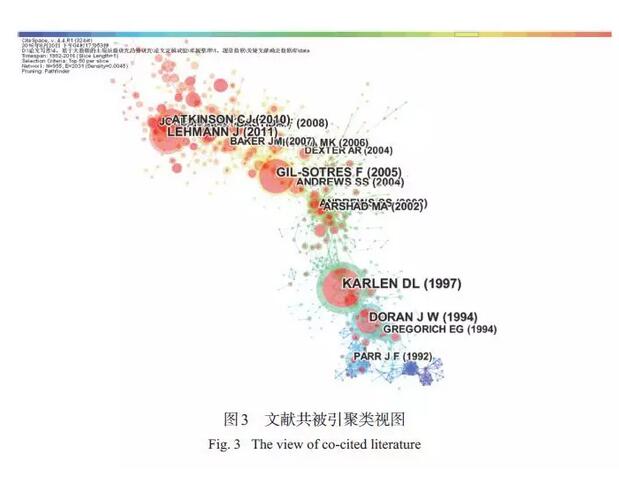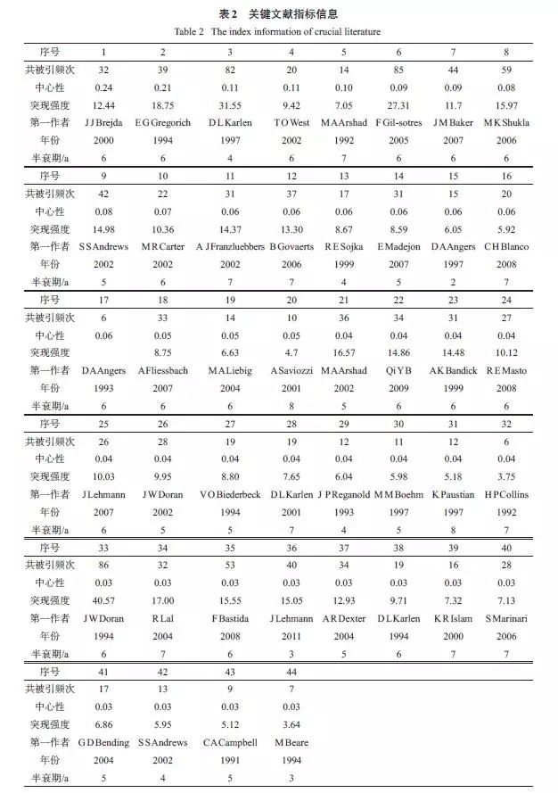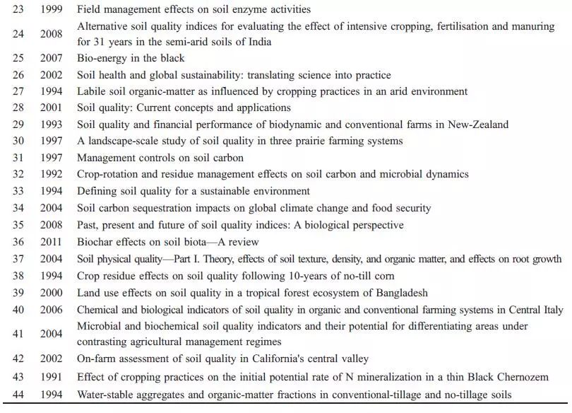經(jīng)典文獻(xiàn)都密切關(guān)注了文獻(xiàn)發(fā)表時(shí)期該領(lǐng)域發(fā)展的熱點(diǎn)問(wèn)題,因其較高的社會(huì)關(guān)注度、創(chuàng)新性和系統(tǒng)性,從而引發(fā)其他學(xué)者大量引用。通過(guò)對(duì)44 篇經(jīng)典文獻(xiàn)內(nèi)容的分析,2000 年以前多關(guān)注農(nóng)業(yè)管理措施對(duì)有機(jī)質(zhì)的影響和土壤質(zhì)量的概念,2000 年以后,對(duì)土壤質(zhì)量評(píng)價(jià)方法、評(píng)價(jià)指標(biāo)尤其是生物學(xué)指標(biāo)的研究不斷興起,更多地注重土壤質(zhì)量在農(nóng)業(yè)和環(huán)境方面的應(yīng)用,2008 年以來(lái),關(guān)于土壤質(zhì)量與全球氣候變化、土壤修復(fù)的關(guān)系研究受到更多學(xué)者關(guān)注。從整個(gè)過(guò)程來(lái)看,土壤質(zhì)量從概念的產(chǎn)生到廣泛的應(yīng)用,一直圍繞農(nóng)業(yè)與環(huán)境的可持續(xù)發(fā)展,這也是人類(lèi)可持續(xù)發(fā)展的主題之一。
