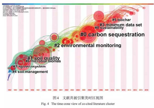 本研究中所認(rèn)為的“研究主題”是指在一定時(shí)段內(nèi),眾多學(xué)者探討和解決的中心問(wèn)題,Citespace V通過(guò)對(duì)文獻(xiàn)共被引的分析,將研究?jī)?nèi)容相似的文獻(xiàn)進(jìn)行歸類(lèi)并命名。通過(guò)對(duì)5 551 篇文獻(xiàn)進(jìn)行共被引分析,共獲取28 個(gè)聚類(lèi),如果聚類(lèi)中文獻(xiàn)數(shù)量較少,則會(huì)影響其命名的準(zhǔn)確性,因此本研究選取文獻(xiàn)數(shù)量在30 篇以上的8 個(gè)聚類(lèi)進(jìn)一步分析,聚類(lèi)的時(shí)間分布和命名見(jiàn)圖 4。通過(guò)圖4 可以發(fā)現(xiàn),研究早期(2000 年以前) 主題較為分散,主要集中在土壤管理(#4)、農(nóng)業(yè)生態(tài)系統(tǒng)(#7)、微生物生物量(#6)、土壤質(zhì)量概念(#1) 等方面,2000 年以來(lái),環(huán)境監(jiān)測(cè)(#2)、碳匯(#0) 研究最多,另外近幾年焦點(diǎn)聚集在可持續(xù)性(#8)、最小數(shù)據(jù)集(#3)、生物炭(#5) 上。