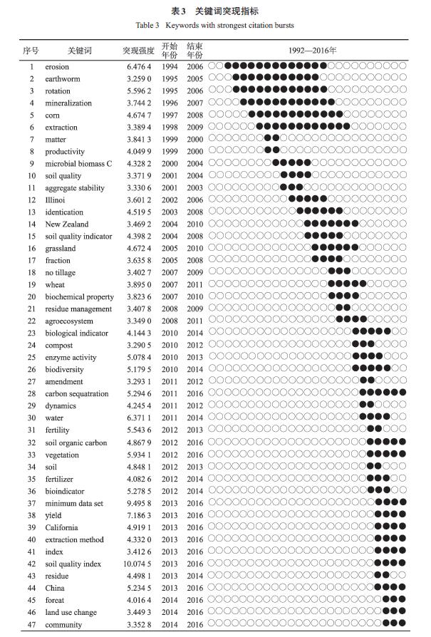 土壤質(zhì)量概念的產(chǎn)生與發(fā)展有著深刻的時(shí)代背景和需求。人類(lèi)發(fā)展的階段性和動(dòng)態(tài)性、全球氣候變化與人類(lèi)活動(dòng)影響的加劇、學(xué)科的不斷交融是決定土壤質(zhì)量主題演變的主要因素。土壤質(zhì)量在20 多年的發(fā)展階段中,涌現(xiàn)了一些標(biāo)志性的經(jīng)典文獻(xiàn),引發(fā)了大量學(xué)者關(guān)注,從而產(chǎn)生了新的研究點(diǎn)。依據(jù)Citespace V理論和分析結(jié)果,本文著重對(duì)文獻(xiàn)中心性高于0.03、突現(xiàn)性高于4、共被引頻次大于30 的關(guān)鍵文獻(xiàn)進(jìn)行分析,綜合以上量化指標(biāo),對(duì)該領(lǐng)域研究熱點(diǎn)及其變遷進(jìn)行了解析。在研究趨勢(shì)方面,截取突現(xiàn)性大于4,開(kāi)始年份為2011年,結(jié)束年份為2016年的關(guān)鍵詞進(jìn)行了分析。