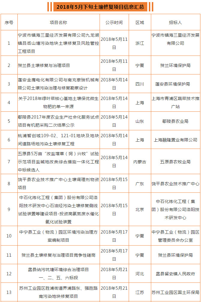 我國(guó)土壤修復(fù)市場(chǎng)前景廣闊,很多土壤修復(fù)項(xiàng)目也在如火如荼地進(jìn)行,5月下旬土壤修復(fù)市場(chǎng)又有哪些項(xiàng)目呢?