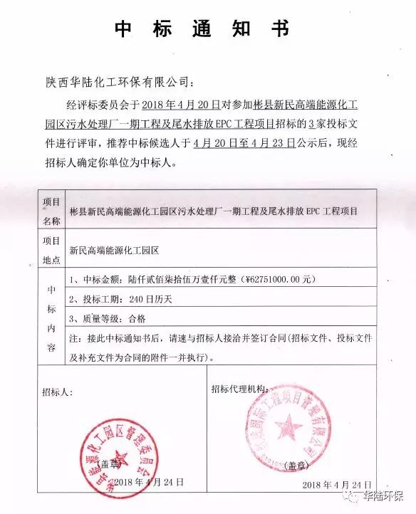 2018年4月24日,陜西華陸化工環(huán)保有限公司成功中標(biāo)彬縣新民高端能源化工園區(qū)污水處理廠一期工程及尾水排放EPC工程項(xiàng)目(以下簡稱:中標(biāo)項(xiàng)目),中標(biāo)金額為6275.1萬元。