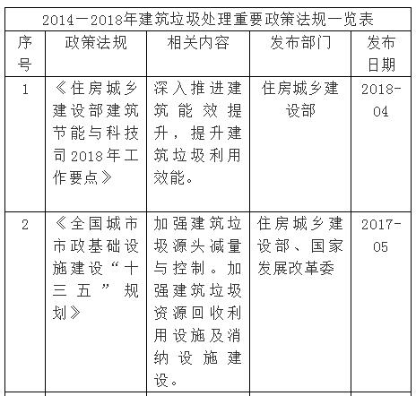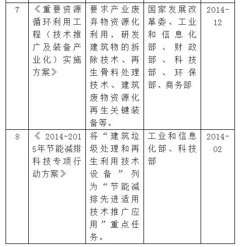 長期以來,由于缺乏統(tǒng)一完善的建筑垃圾管理辦法和良好的產(chǎn)業(yè)扶持政策致使建筑垃圾絕大部分未經(jīng)任何處理便被露天堆放或簡易填埋,如何處理和利用建筑垃圾,已經(jīng)成為政府所面臨的一個重要難題。為了解決建筑垃圾處理難題,促進建筑垃圾循環(huán)利用,國家近幾年頒布了一系列的政策法規(guī),具體政策如下: