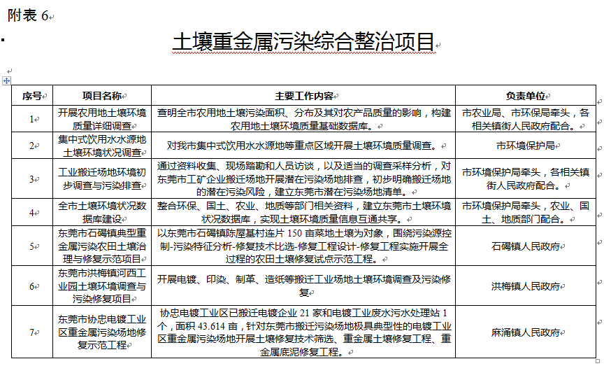 開展東莞市土壤污染調(diào)查、搬遷工業(yè)廢棄地重金屬污染修復(fù)技術(shù)集成與工程示范、典型農(nóng)田重金屬污染綜合防治技術(shù)工程示范等項目。開展涉重金屬企業(yè)污染防治技術(shù)示范項目16項,具體名單見附表5。土壤重金屬污染綜合整治項目7項,具體見附表6。