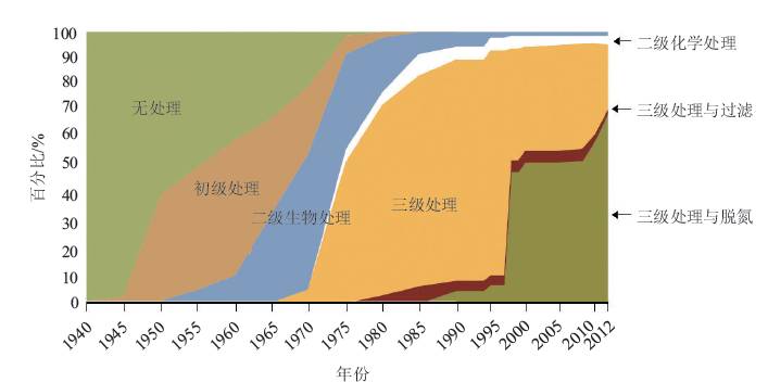 如今,瑞典所有城市家庭的污水在排放到自然之中之前都得到了處理。超過95%的家庭污水都經(jīng)過生物和化學(xué)處理。地處城市地區(qū)以外的約70萬個(gè)家庭擁有小型污水處理系統(tǒng)。與擁有自己專門的污水處理廠的工業(yè)源水排放相比,城市地區(qū)以外的家庭所排出的這些小規(guī)模且零散的營養(yǎng)物質(zhì),是瑞典湖泊、河流、沿海水域的富營養(yǎng)化問題更重要的原因。瑞典污水處理問題的歷史發(fā)展如下圖所示。