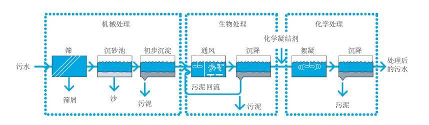 在20世紀(jì)60年代至70年代,瑞典修建了更多現(xiàn)代化的污水處理廠之后,極大地減少了磷和有機(jī)物的排放量。近十年來,磷和生化需氧量的處理水平保持在95%左右。另一方面,自2010年起,瑞典的平均氮凈化水平一直維持在60%左右(瑞典環(huán)保署,2014)。從20世紀(jì)80年代中期開始,增加了一些新的凈化方法,確實(shí)大幅提高了較大污水處理廠向氮敏感受體排放的氮的凈化水平。污水處理廠的處理過程如圖。