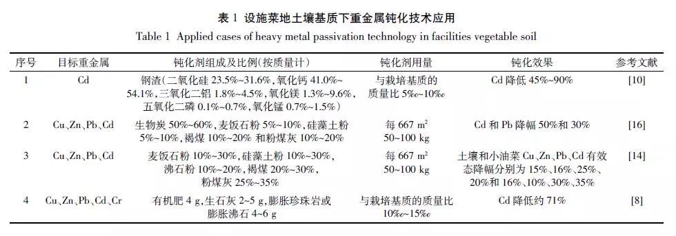 設(shè)施菜地土壤基質(zhì)重金屬的鈍化技術(shù)的研究方法以田間試驗為主,少量采用實驗室內(nèi)試驗的方法。涉及的主要污染物有Pb、Cd、Cr、Cu、Zn 5種。用到的鈍化劑主要有(1)黏土礦物,如麥飯石粉、硅藻土粉等;(2)碳材料,如秸稈炭等;(3)硅鈣材料,如生石灰、珍珠巖等;(4)有機(jī)物料,如褐煤等;(5)工業(yè)廢棄物,如粉煤灰、鋼渣。每667 m2土壤中重金屬鈍化劑的用量為50~100 kg。鈍化劑組分中,按質(zhì)量百分比計,生物炭50%~60%、麥飯石粉5%~30%、硅藻土粉5%~30%、褐煤10%~30%、粉煤灰10%~35%、有機(jī)肥40%、生石灰20%等。對比不同元素的鈍化效果,土壤中重金屬有效性平均降幅為Cd(29%)>Zn(24%)>Pb(23%)>Cu(22%),差異性不顯著。然而,蔬菜中重金屬有效性平均降幅為Cd(53%)>Pb(31%)>Cu(12%)>Zn(11%)。麥飯石、硅藻土、沸石土等非金屬礦物均具有較強(qiáng)的吸附、離子交換等特性,此類礦物及其改性產(chǎn)物與生態(tài)環(huán)境具有良好的協(xié)調(diào)性,已廣泛應(yīng)用于無機(jī)和有機(jī)污染的處理。試驗證明,重金屬鈍化劑對土壤和小油菜Cu、Zn、Pb、Cd 有效態(tài)降幅分別是15%、16%、25%、20%及16%、10%、30%、35%,可單獨施入設(shè)施菜田,也可與底肥混拌后施用。生物炭具有多孔性、較大的比表面積、較強(qiáng)的表面吸附能力、高度的化學(xué)惰性,對有機(jī)和無機(jī)污染物具有高度的親和力,可作為土壤中污染物的鈍化劑。生物炭配施麥飯石、硅藻土、褐煤、粉煤灰為主要原料的鈍化劑,Cd 和Pb降幅可以實現(xiàn)50%和30%。鋼渣作為大量存在的工業(yè)廢棄物,能夠顯著降低植株中的Cd 45%~90%,其效果優(yōu)于粉煤灰、赤泥和石灰(表 1)。