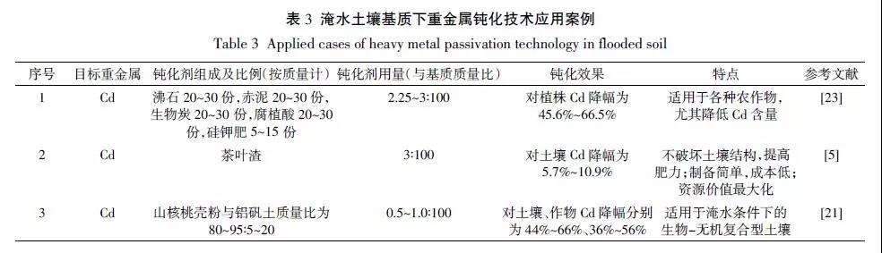 現(xiàn)有的一些鈍化劑具有氧化特性,因此只適用于旱地土壤(耗氧條件),長期淹水條件下有可能因還原變性而喪失固定能力。淹水土壤基質(zhì)重金屬的鈍化技術(shù)研究以田間試驗為主,少量采用實驗室內(nèi)盆栽方法。涉及的主要污染物為Cd。用到的鈍化劑主要有(1)黏土礦物,如沸石等;(2)碳材料,如生物炭等;(3)硅鈣材料,如硅鉀肥、鋁礬土復(fù)合制劑等;(4)有機(jī)物料,如腐植酸、茶葉渣及山核桃殼粉等;(5)工業(yè)廢棄物,如赤泥、污泥等。鈍化劑的用量為土壤基質(zhì)質(zhì)量的0.5%~3%,對土壤Cd 的降幅為5.7%~66%,對作物Cd的降幅為36%~66.5%。以湘中某工礦區(qū)稻田淹水土壤受到了嚴(yán)重的重金屬污染為例,污染程度為Cd> Pb > Zn。在淹水3、6、9 個月后,Zn、Cu、Pb、Cd 的殘渣態(tài)基本保持不變,說明短時間的處理對原生相重金屬的影響不大。4 種重金屬形態(tài)均以殘渣態(tài)最低,特別是Cu 和Cd。山核桃殼富含纖維素和半纖維素等生物質(zhì),吸附能力較強(qiáng),已見利用山核桃殼對水環(huán)境中Cu、Cr、Hg、Cd 等的吸附效果,然而相對于水環(huán)境,吸附土壤重金屬的影響因素更為復(fù)雜。鋁礬土為明礬煉制過程中的副產(chǎn)物,磨碎后具有粒度細(xì)、分散性好、比表面積大等特點。郭彬等首次公開了將山核桃殼和鋁礬土開發(fā)為土壤重金屬鈍化劑的報道,對土壤、作物Cd 降幅分別為44%~66%、36%~56%。楊占彪等首次公開了茶葉渣作為鈍化劑應(yīng)用于土壤Cd 污染,Cd 降幅為5.7%~10.9%。施入茶葉渣不會破壞土壤的結(jié)構(gòu),還可以提高肥力,制備方法簡單,成本幾乎為零(表3)。不同鈍化劑對于不同種類和性質(zhì)的重金屬鈍化效果存在一定差異,因而,在實際應(yīng)用中對重金屬具有一定的選擇性;對于復(fù)合污染土壤來說,單一的鈍化劑很難達(dá)到修復(fù)應(yīng)用的標(biāo)準(zhǔn)。