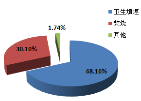 目前,我國(guó)城市生活垃圾無害化處理方式包括:衛(wèi)生填埋、高溫堆肥和焚燒,圖1為2014年我國(guó)垃圾處理方式比例,顯示我國(guó)仍然以填埋為主[2]。但焚燒憑借其減量效果最明顯、無害化最徹底、且焚燒熱量可以有效利用的特點(diǎn),近年來比例上升很快,可以預(yù)見,焚燒正逐步成為處理城市垃圾的最主要方式。