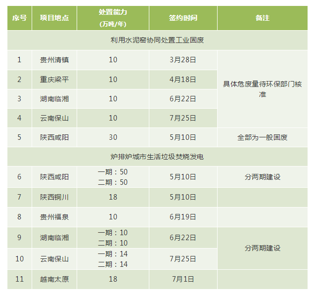 2018年二季度以來(lái),公司新增簽約11個(gè)環(huán)保項(xiàng)目,其中利用水泥窯協(xié)同處置工業(yè)固廢危廢項(xiàng)目5個(gè)、爐排爐垃圾焚燒發(fā)電項(xiàng)目6個(gè),新增處理生活垃圾194萬(wàn)噸/年、處置固廢危廢70萬(wàn)噸/年的產(chǎn)能規(guī)模。
